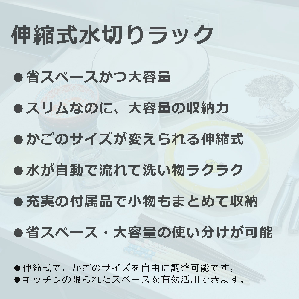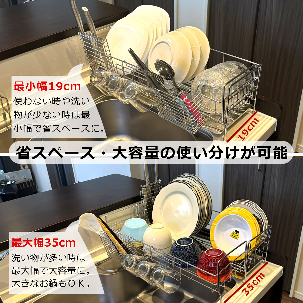シンクの幅に合わせて自由に調整できる、伸縮式ステンレス水切りラック。